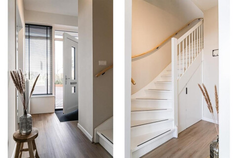 Begane grond: entree met ruime hal, modern toilet met fonteintje en een grote (slaap)kamer die ook perfect te gebruiken is als werkkamer of logeerkamer.
