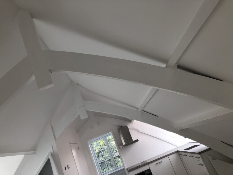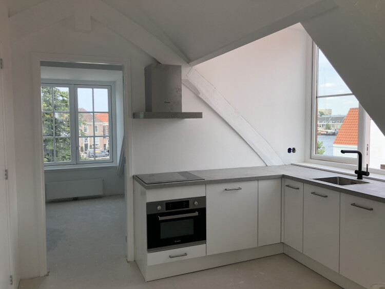 Het appartement wordt nieuw opgeleverd en heeft een open leefruimte met woonkamer, eetgedeelte en keuken. Dankzij de ruime dakkapellen stroomt het natuurlijke licht binnen, iets wat optimaal verspreid wordt door de witte muren. De houten vloeren zijn afgestemd op de prachtige houten balken in het plafond, waardoor de woning een sfeervol karakter heeft.