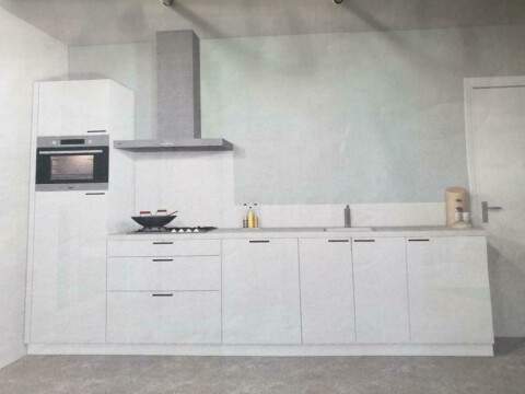 Nieuwe luxe open witte keuken met vaatwasser, inductie, inbouwoven ( combi magnetron), koelkast met vriesvak en afzuigkap.