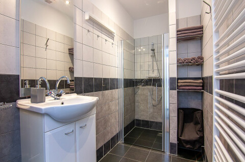 2e verdieping: ruime woonkamer met hoog plafond, loggia op het zuiden met prachtig uitzicht over de stad. Slaap/werkkamer met dakkapel. Wasruimte met wasmachine, -droger en wastafel.