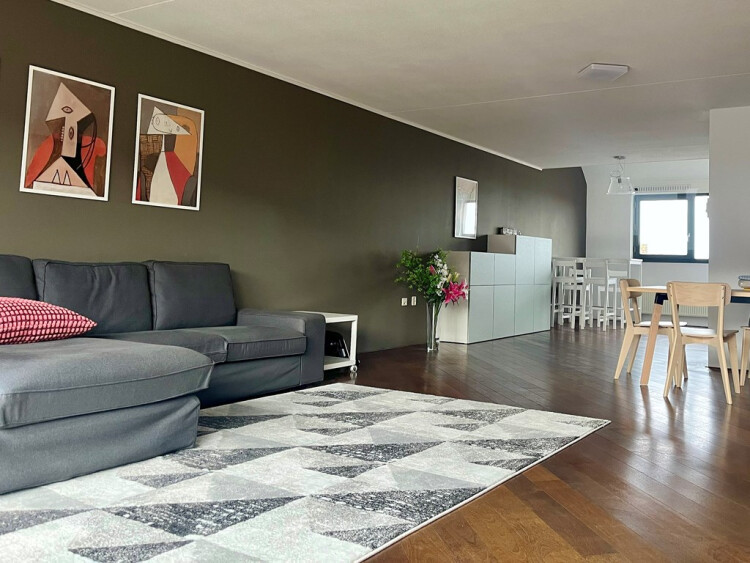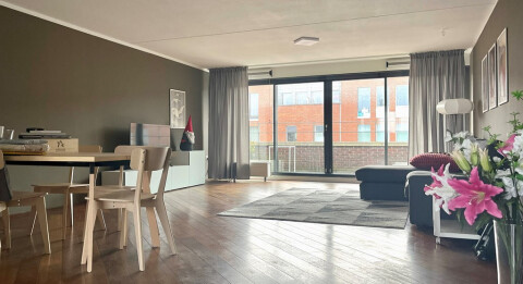 5e etage: entree appartement, hal, slaap/werkkamer (ca. 3.50 x 2.15 m), toilet, wasruimte met wasmachine en droger, L-vormige woon/eetkamer (ca. 7.10 x 5.15 m) met houten vloer en toegang tot het op het zuiden gelegen balkon (circa 5 x 1.85 m). Half open keuken met inbouwapparatuur (vaatwasser, koelkast/vriezer en combi-oven).