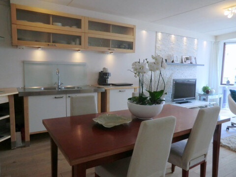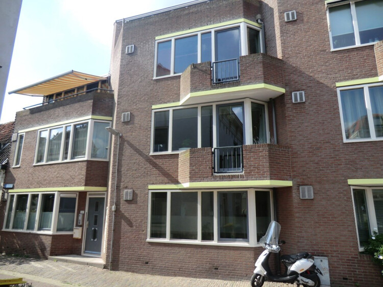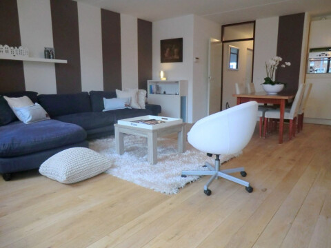 1e etage: hal, lichte woonkamer (ca. 37 m2) met houten vloer en deur naar Frans balkon aan de voorzijde, met uitzicht over het centrum van de stad. Moderne open keuken met vaatwasser, combi oven/magnetron, koelkast en koffie machine. Slaapkamer (ca. 4.25 x 3.00 m.) met inloopkast, waarin ook aansluiting is voor de wasmachine en -droger, extra kastruimte en toegang tot zonnig balkon, tweede slaapkamer (ca. 3.25 x 3.75 m.), badkamer met douche en wastafel, apart toilet.
