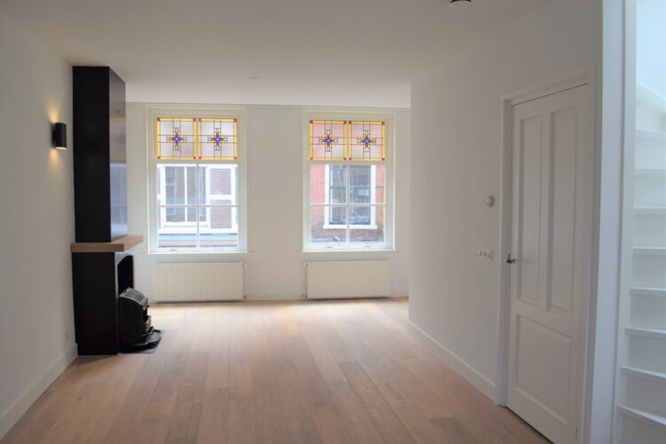 1e verdieping: hal, woon/eetkamer (8.95 x 4.41) met houten vloer en hoge ramen met leuk uitzicht over de winkelstraat. Open keuken met vaatwasser, keramische kookplaat, oven, koelkast en vriezer. Openslaande deuren naar het besloten dakterras (2.50 x 4.38) op het noord-westen.