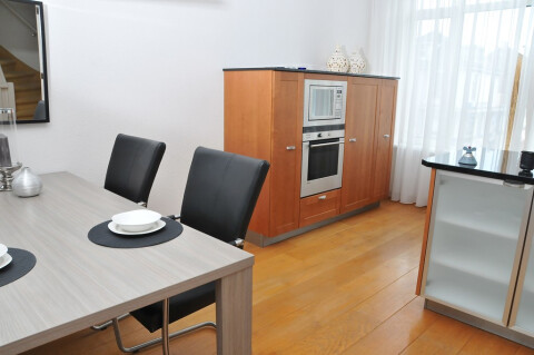 The apartment has been completely renovated, has a beautiful oak parquet floor and a luxurious Poggenpohl kitchen with all imaginable appliances such as an induction hob, dishwasher, luxury 0 degrees refrigerator, hot air oven, a separate microwave and granite worktop.
