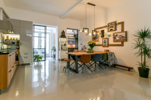 Entree, hal met garderobekast, stalen deuren naar de fraai ingerichte woon/eetkamer met hoog plafond. Luxe open keuken met inbouwapparatuur. Stalen deuren naar hal met toegang tot de patio, wasruimte en WC. Ruime slaapkamer met deur naar de luxe badkamer met inloopdouche, wastafelmeubel en WC. In de brede vensterbank in de woonkamer is een heerlijk zitje gemaakt om te genieten van de ochtendzon, ook geschikt als werkplek.