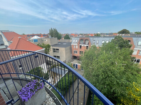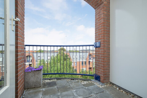 Trap naar bovenste etage brengt je in de sfeervolle woonkamer met veel licht en toegang tot het zonnige balkon alwaar je op een zonnige ochtend heerlijk je ontbijt kunt gebruiken met mooi uitzicht op groen en de stad.