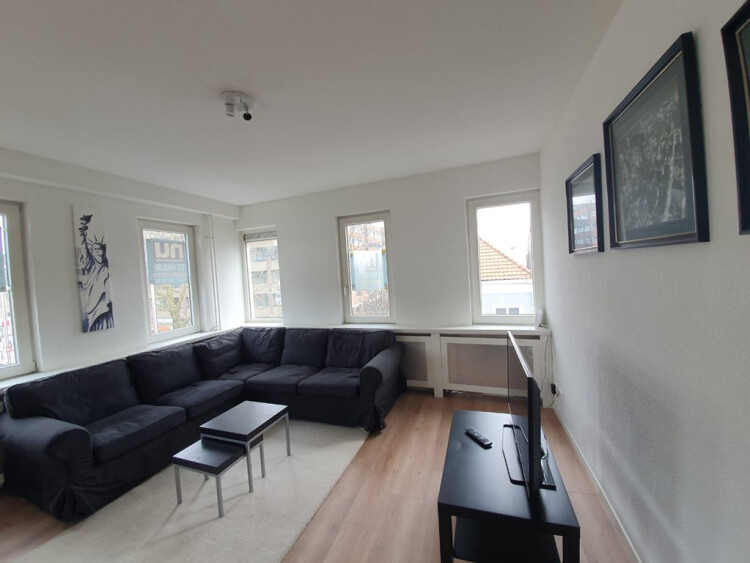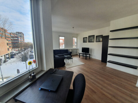 De woonkamer is gemeubileerd en heeft een heerlijke hoekbank en een eettafel met 4 eetkamerstoelen. Vanaf de woonkamer heb je toegang tot de slaapkamer. In de slaapkamer bevindt zich een 2 persoonbed (180x200) en een grote kledingkast en tevens is hier de toegang tot de extra 3e aparte werkkamer. De moderne badkamer is voorzien van een wastafel, douchehoek en zwevend toilet. Tevens is er een wasmachine en een wasdroger aanwezig in de badkamer.