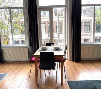 Een licht en ruimtelijk ( door hoge plafonds) appartement op 1*e etage met 2 slaapkamers en een heerlijk zonnig terras/ balkon.