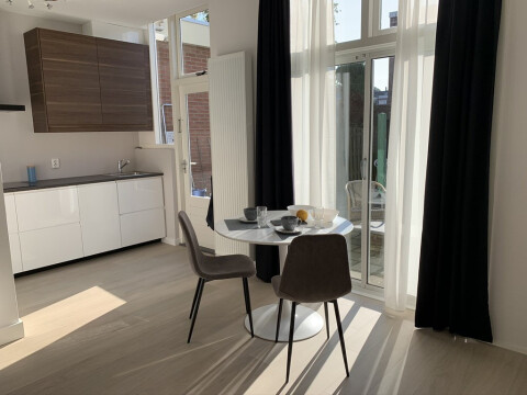 Ook voor kortere periode beschikbaar! / ALLES NIEUW!! Dichtbij treinstation! Volledig gerenoveerde licht en modern gemeubileerde benedenwoning met 1 slaapkamer en royaal zonnig terras / tuin!