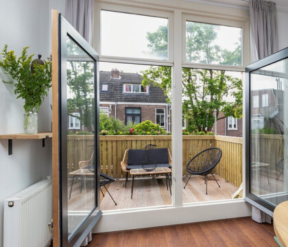 Maar zomers weer heerlijk dat aan de andere kant van de ruimte er 2 openslaande deuren zijn naar een zonnig dakterras.