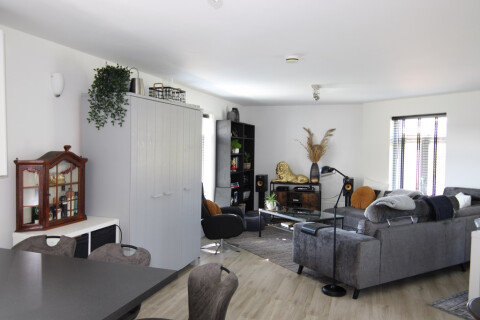Begane grond: Gezamenlijke entree, trap naar 2e etage. Ruime lichte woonkamer met open keuken voorzien van gasfornuis, afzuigkap, oven en koelkast met vriesvak. Badkamer met inloopdouche, wastafel, toilet en wasmachine aansluiting. Ruime slaapkamer aan de achterzijde gelegen.