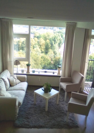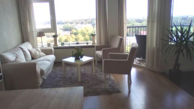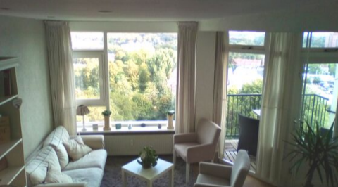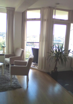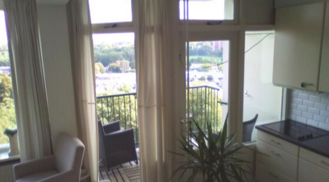 - The living room with the open kitchen has, through the large windows, lots of light. In addition, you can reach the balcony that is situated on the east and has a wonderful view over green areas and the center of Haarlem. The kitchen is equipped with a microwave/oven, fridge, 4-burner stove.