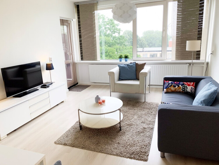 - Fresh, light and modern apartmentVolledig fris en modern gemeubileerde en verbouwd appartement gelegen op de vijfde verdieping met zonnig balkon op het zuiden en eigen berging op de begane grond.