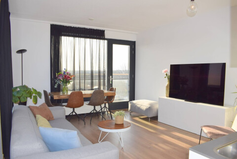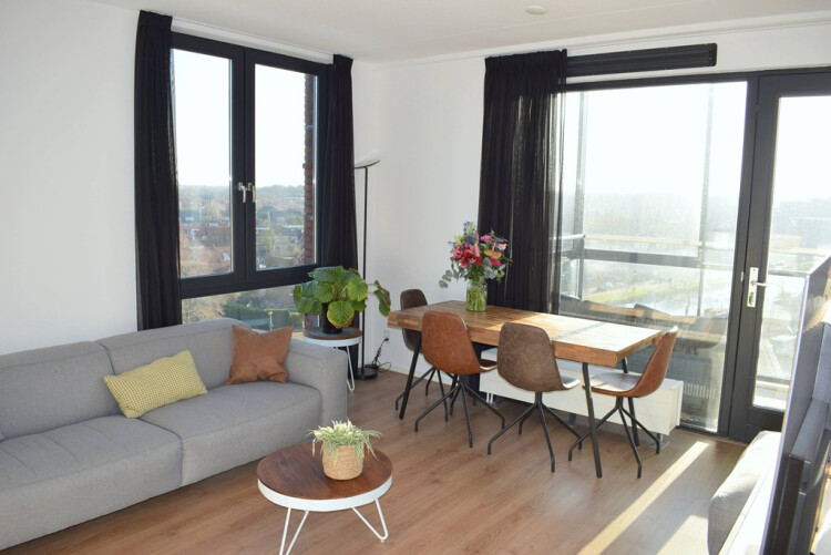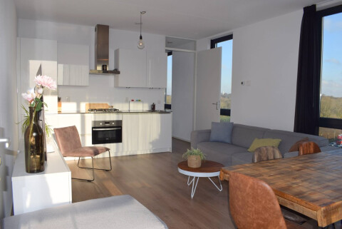 6e verdieping: entree appartement. De woning is voorzien van een mooie laminaatvloer. L-vormige hal met kapstok, woon-/eetkamer met open keuken, grote raampartijen (op het zuidwesten) en toegang tot het ruime balkon. Keuken met koel/vries-combinatie, 4 pits gaskookplaat, combi-oven/magnetron en vaatwasser. Ruime slaapkamer met grote kast en toegang tot tweede (mini) balkon. Badkamer met inloopdouche, wastafel en hoge inbouwkast. Apart toilet. Wasruimte met aansluiting voor een wasmachine en veel bergruimte.