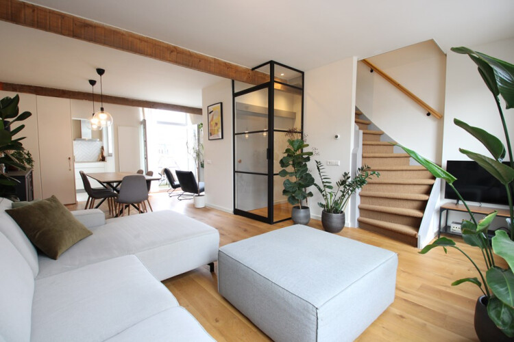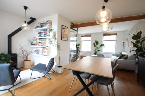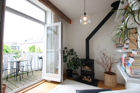 Delightful, traditional, yet fully renovated in 2019, fully furnished and stylishly decorated upstairs apartment with open beams, 2 bedrooms, a balcony and a roof terrace. Located just a short walk to the centre of the old town of Haarlem with its charming small streets, shops, restaurants and artistic community. The apartment is presented on 2 different levels, with the living room with dining area and kitchen on the first floor with balcony with dining table (and BBQ), and the two bedrooms, bathroom and roof terrace on the 2nd floor. The station is within a 10-minute bike ride as are the fast bus stops (Schipholweg bus stop) giving easy access to Amsterdam and Schiphol Airport. A parking permit is obtainable (122euro per YEAR).