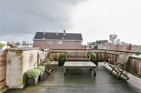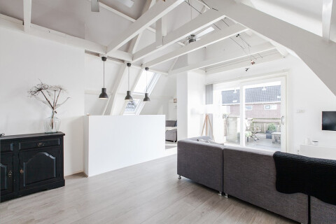 2e etage: overloop met kast voor wasmachine en droger. Ruime woonkamer (ca. 7.68 x 5.12 m.) met prachtige kapconstructie in het zicht met verhoogd eetgedeelte en schuifpui naar het riante dakterras (16 m2) op het zuidoosten. Moderne open keuken met kookeiland en diverse inbouwapparatuur (vaatwasser, koelkast met vrieslades, combi-oven/magnetron, gaskookplaat). Slaapkamer met inbouwkasten (ca. 3.10 x 3.25 m.), modern badkamer met inloop (regen)douche, brede wastafel met onderkast, separaat toilet.