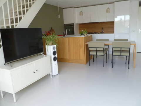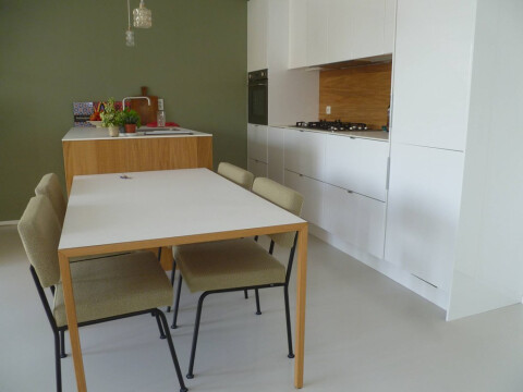 De opstelling van de keuken, de mooie strakke vloer, en het licht creeert een relax lounge sfeer omdat alles, de living inclusief de keuken en eethoek in elkaar overvloeit.