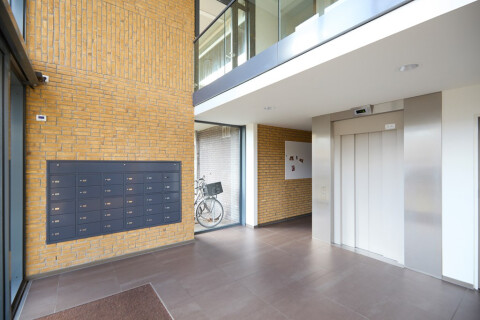Ground floor: shared hall with mailboxes, intercom system, closed entrance complex, elevator and staircase.