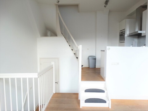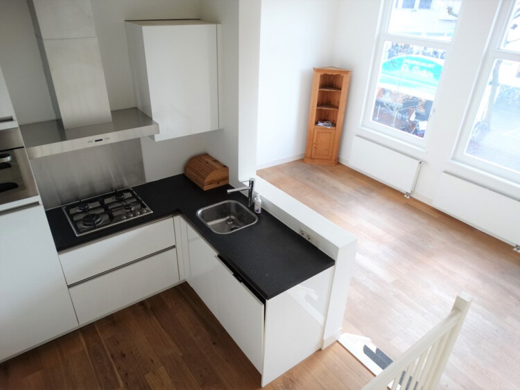 1e etage; Separaat toilet, ruime woonkamer met grote hoge ramen en houten vloer. Open keuken van alle gemakken voorzien. De woning heeft een speelse split level indeling.