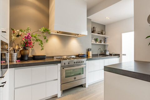 Eerste verdieping: deur naar de open woonkamer, (totaal ca. 70 m2) met houten vloeren en hoge plafonds. L-vormige woonkamer aan de voorzijde van het pand, grote open moderne keuken (kookparadijs!) met gaskookplaat (5 pits) grote oven met afzuigkap, koelkast en vriezer, vaatwasser, Quooker (kookwaterkraan) en kookeiland maakt dit ideaal voor gezelschap tijdens het koken. Traditionele open haard / kachel tegenover het kookeiland en de serre, momenteel gebruikt om te dineren, met Franse deuren naar het ruime dakterras (18m2) met vrij uitzicht. Bijkeuken aan de achterzijde (ook met toegang tot het terras) herbergt de aansluitingen voor de wasmachine en droger.