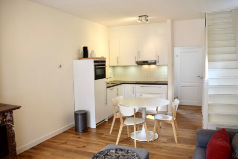 1e verdieping: dakterras (ca. 10 m2) en buitenberging. Hal met garderobe, toilet. Comfortabele woon/eetkamer (ca. 26 m2.) met houten vloer en uitzicht op trendy winkelstraat (Gierstraat). Moderne open keuken met inbouwapparatuur (koel/vriescombinatie, vaatwasser, over/magnetron en inductiekookplaat).